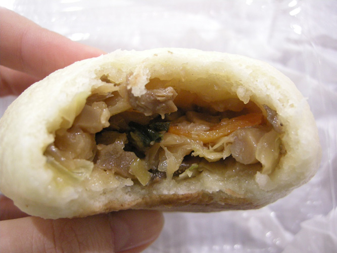 しめじや椎茸を野菜と一緒に醤油で炒めた具を包み込んでます。