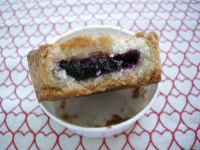 もっさりした生地の食感の中には甘酸っぱいブルーベリーソースが。