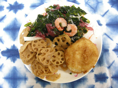 えびのグラタンコロッケ、レンコンの金平、海藻の大根サラダ