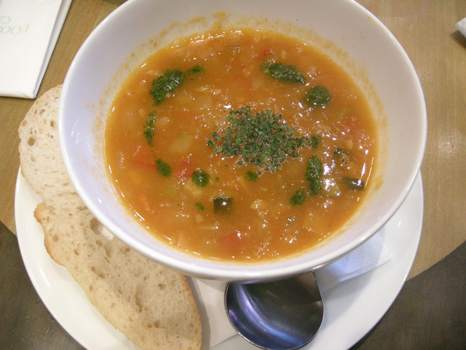まあでも気を取り直して注文したのは季節のスープ(ミネストローネ)、パン付き(900円)