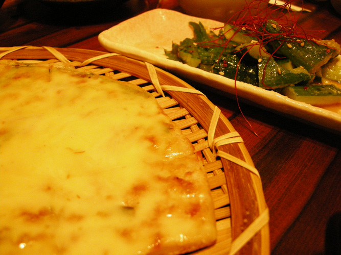 ↑チーズチヂミ、キュウリとにんにく和え