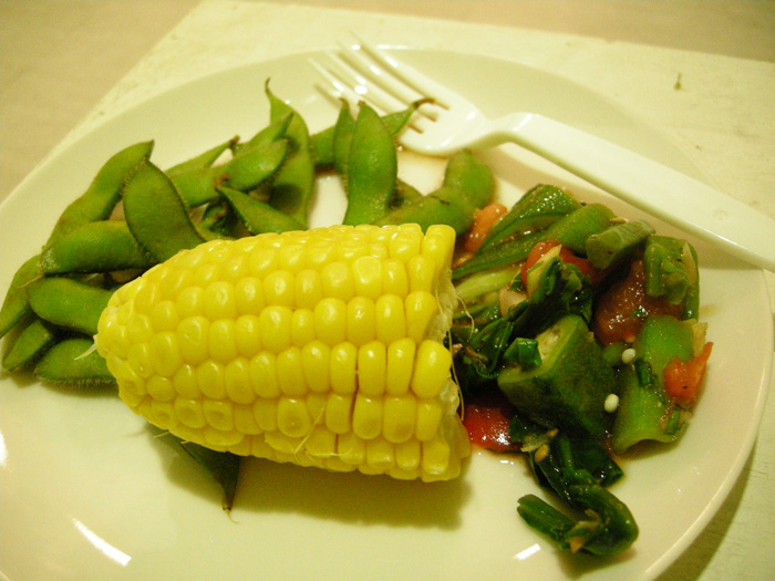 ↑とうもろこし、枝豆、オクラとトマトのねばねばサラダ