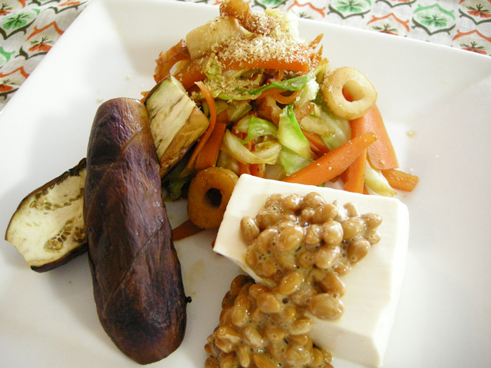 にんじんとちくわのオイスターソースきんぴら、焼き茄子、納豆豆腐