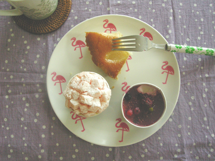 写真は杏仁ベリーと昨日いただいた洋梨ケーキを一口づついただいてますー