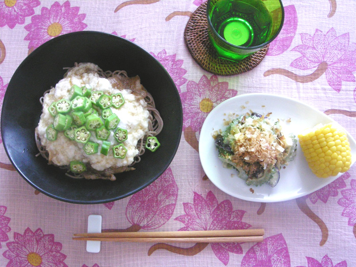 豚肉のとろろかけ蕎麦、ゴーヤと茄子のチーズサラダ、とうもろこし3/1