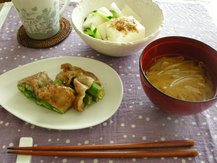 オクラの豚肉巻き、キュウリと山芋の冷奴、キノコともやしのみそ汁