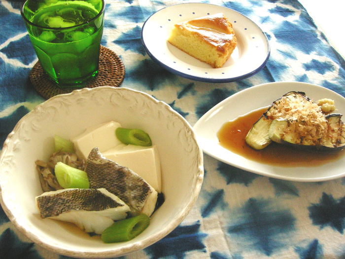 タラの酒蒸し、焼きナス、洋梨のケーキ