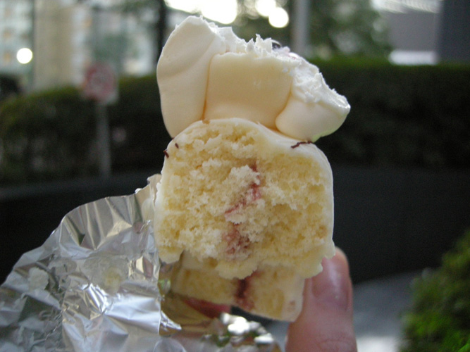 ふわっとした優しい口当たりだけど、食べがいのある生地に、甘いクリームとイチゴが入ってます。