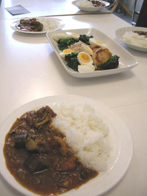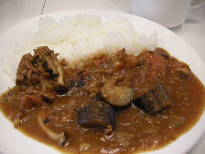 ざく切りにしたトマト(多めに)、茄子、しめじ、牛挽肉にみじん切りの玉ねぎを入れてルーを加えたら時折混ぜながら煮込むだけ。